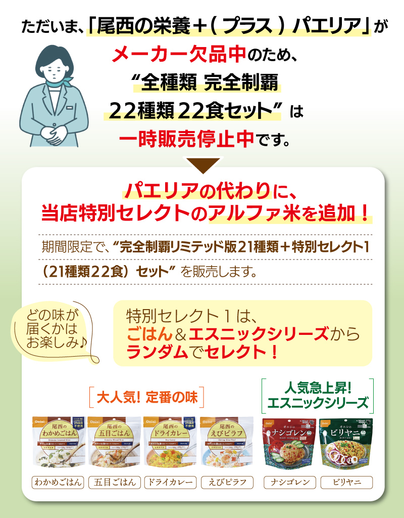 アルファ米 完全制覇 21種類 22食 7日分(21種類+特別セレクト1) 尾西食品 非常食セット