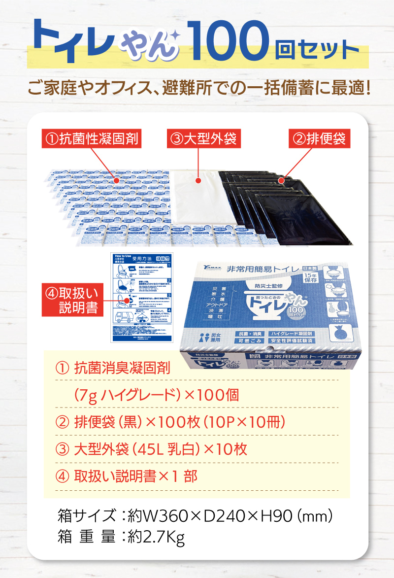 \15年買い替え不要/ 15年保存 簡易トイレ 100回分 日本製 防災士監修 抗菌 消臭 凝固剤 BCP対策 コスト削減 YAMAX 災害用 非常用 トイレ 非常用簡易トイレ 困ったときの トイレやん 100回セット | 15年保存 日本製 抗菌 消臭 凝固剤 | 災害用トイレ 携帯トイレ 防災グッズ 防災セット 備蓄 防災 災害 断水 地震 台風 介護 車 渋滞 嘔吐 アウトドア 国産 100回分