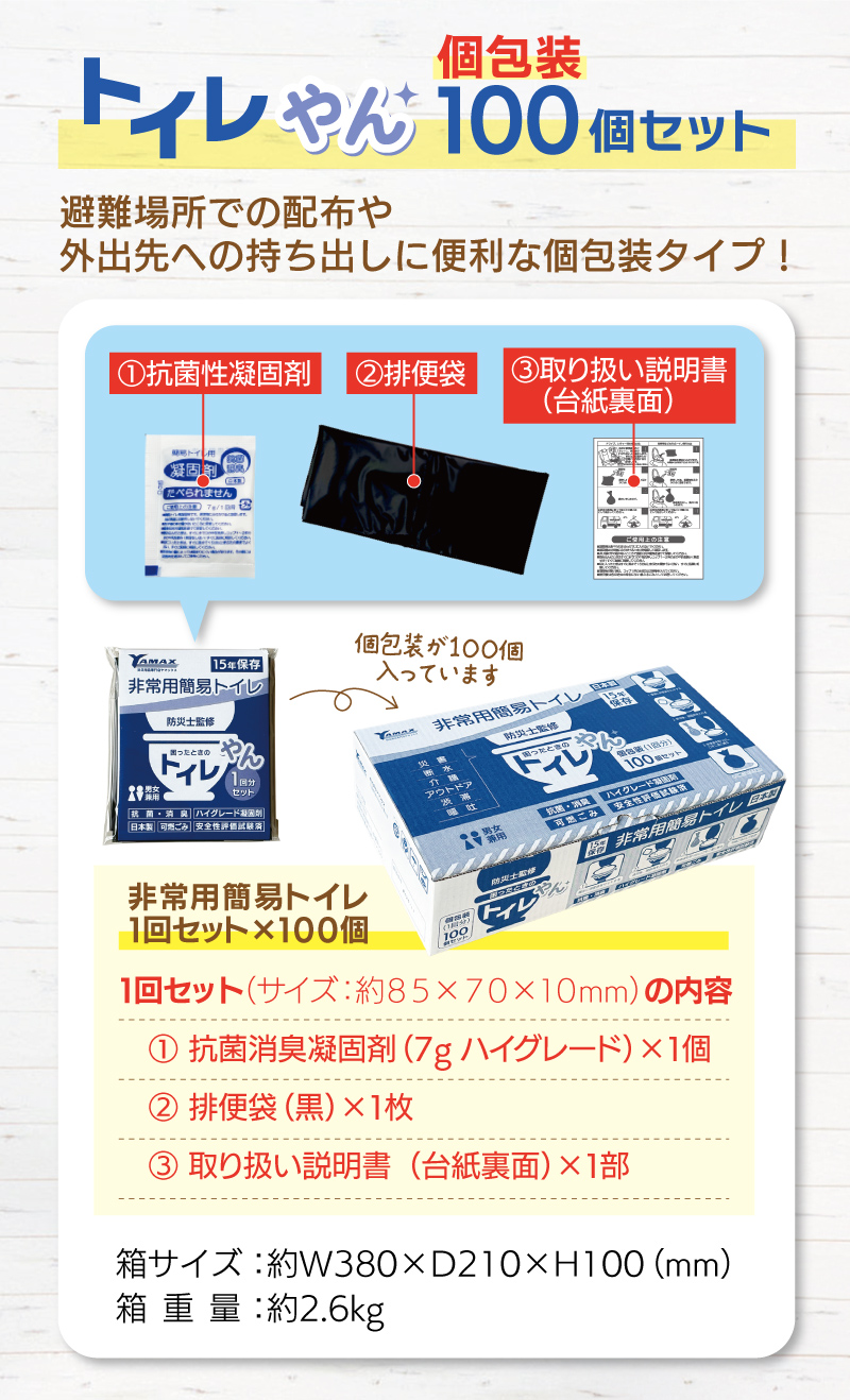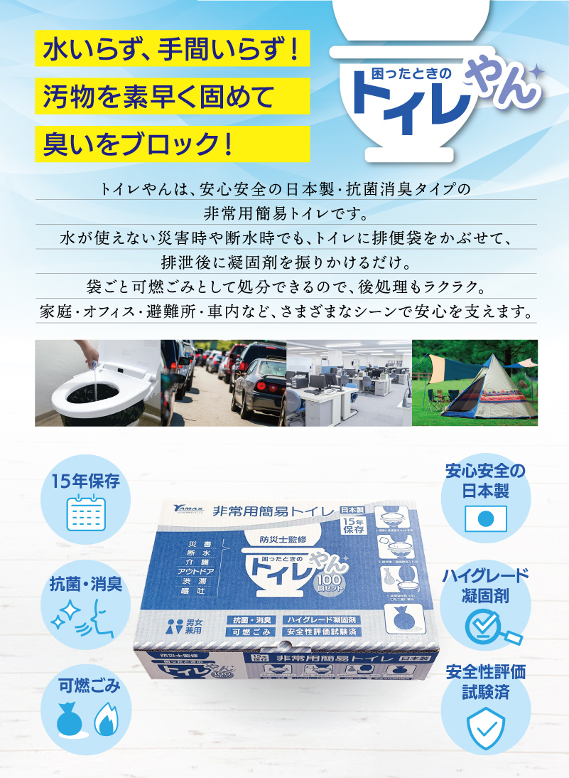 \15年買い替え不要/ 15年保存 個包装 簡易トイレ 100個分 日本製 防災士監修 抗菌 消臭 凝固剤 BCP対策 配布用 YAMAX 災害用 非常用 トイレ 非常用簡易トイレ 困ったときの トイレやん 個包装 100個セット | 15年保存 日本製 抗菌 消臭 凝固剤 | 携帯トイレ 配布用 災害用トイレ 防災グッズ 防災セット 備蓄 防災 断水 地震 台風 介護 車 渋滞 嘔吐 アウトドア 国産 100個分