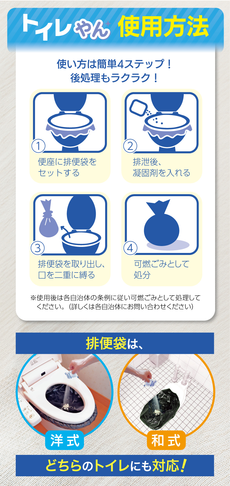 水が使えない災害時や断水時でも、トイレに排便袋をかぶせて、排泄後に凝固剤を振りかけるだけ。